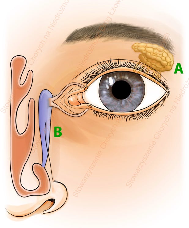 Lacrimal system: A- lacrimal gland; B- lacrimal drainage pathways
